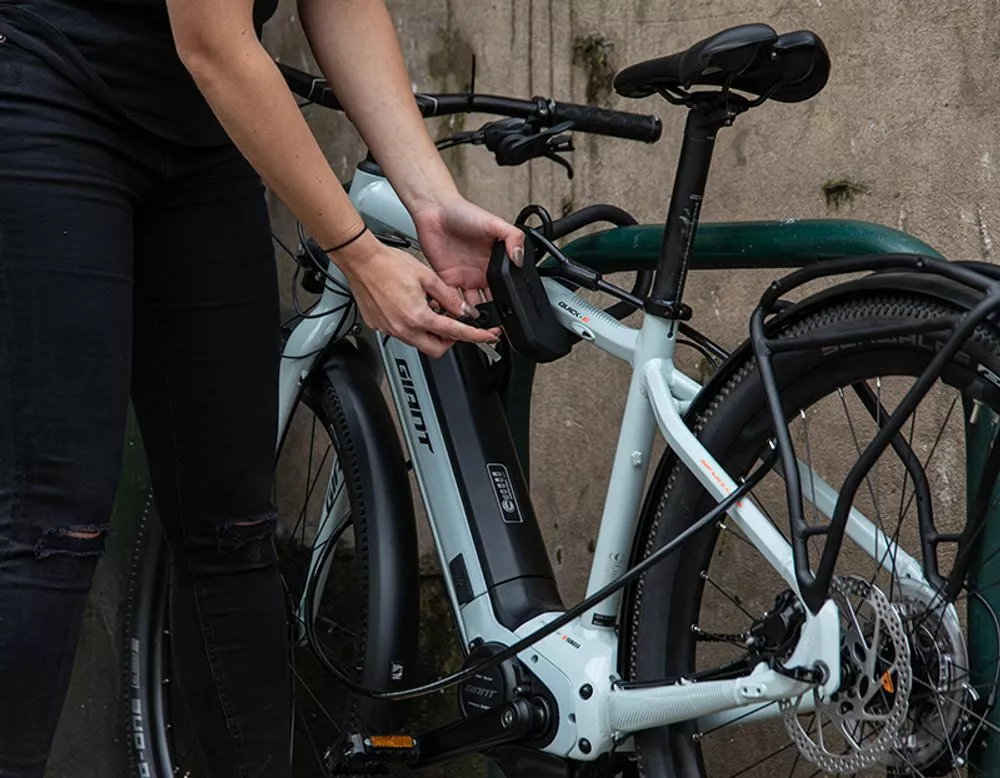Das patentierte CLIP+RIDE-System von Hiplok ermöglicht einen komfortablen Transport am Taschen-/Rucksackgurt – keine Halterung erforderlich.