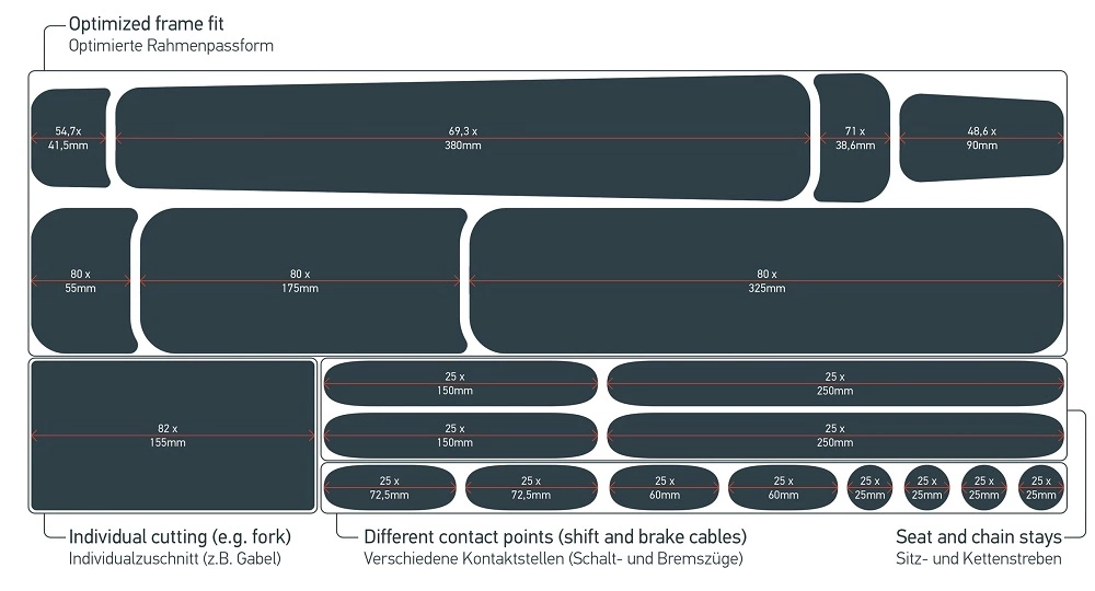 Durch das einfache Kombinationssystem kannst Du den Universalzuschnitt für viele gängige Rahmengrößen verwenden. Für alle die es besonders gut geschützt wollen, gibt es zusätzliche Klebepunkte die unterhalb der Kabelzüge oder an anderen Stellen angebracht werden können.