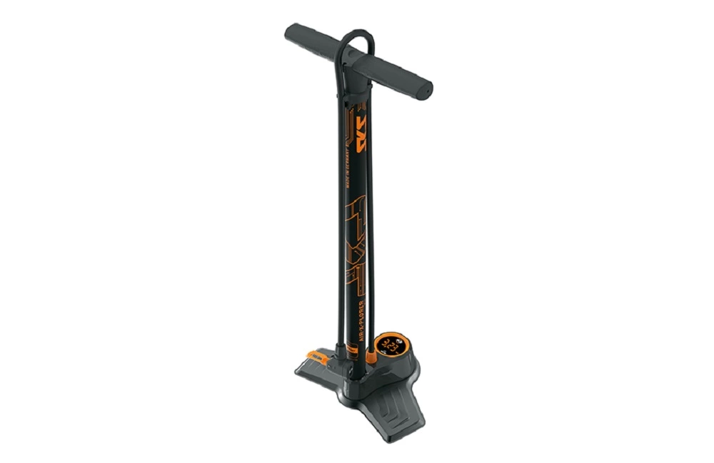 Das große Stahlrohr und der solide Metallfuß garantieren eine gute Kraftübertragung, so dass sich höhere Drücke (476 cm³ Hub) mühelos in den Reifen pumpen lassen.