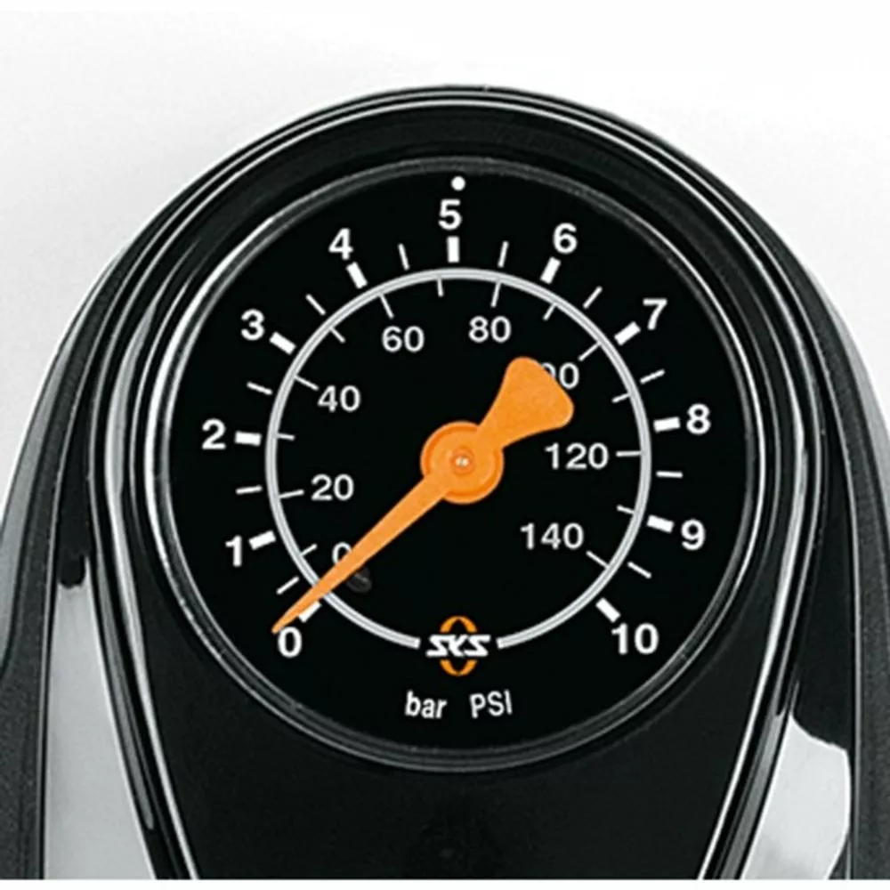 Der Druck wird in bar und psi angezeigt. Durch den bewährten SKS MULTI VALVE-Pumpenknopf mit Klemmhebel ist sie sehr einfach in der Handhabung.